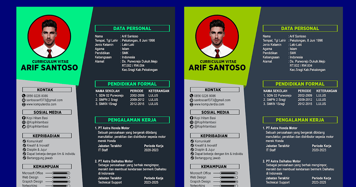 Anda bisa dengan mudah mengisi profil, menambahkan detail pengalaman dan keahlian yang ingin anda tonjolkan, mengubah desain dan layout, hingga cv terbaik anda siap untuk dicetak. Membuat curriculum vitae sendiri dengan bantuan template cv ini memang cara konvensional namun tetap penting. May 14, 2017 · serta di contoh cv, jangan menggunakan nama yang berlebihan atau aneh untuk alamat email seperti celaluimuth@gmail.com. Selain beberapa contoh daftar riwayat hidup di atas, masih ada contoh resume lamaran kerja yang dibuat dengan format yang unik dan menarik. Itulah contoh cv yang lengkap, menarik, dan mudah dibuat oleh para pemula.